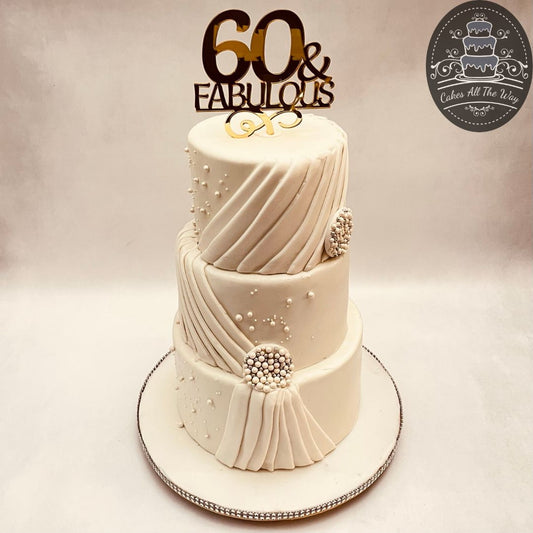 3-Tier White Drapes 60th Birthday Theme Cake